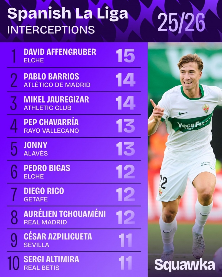 Cách đây vài ngày, Squawka đã đếm số lần đánh chặn ở La Liga mùa này. Barrios đứng thứ hai với 14 lần, và Joan Armene đứng thứ sáu với 12 lần.