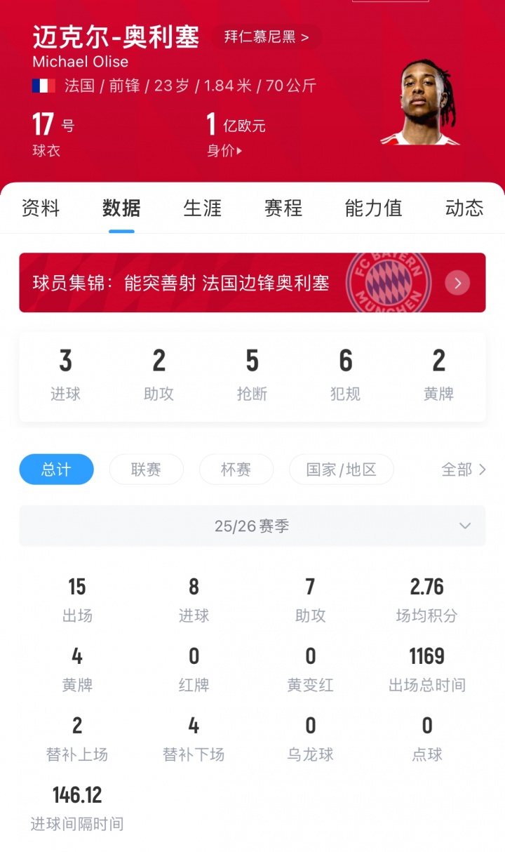 Olise 23 tuổi và chơi ở vị trí tiền vệ cánh phải. Anh đã ra sân 15 lần cho Bayern mùa này và đóng góp 8 bàn thắng cùng 7 đường kiến tạo. Hợp đồng của anh với Bayern sẽ hết hạn vào năm 2029 và anh hiện có giá trị 100 triệu euro.